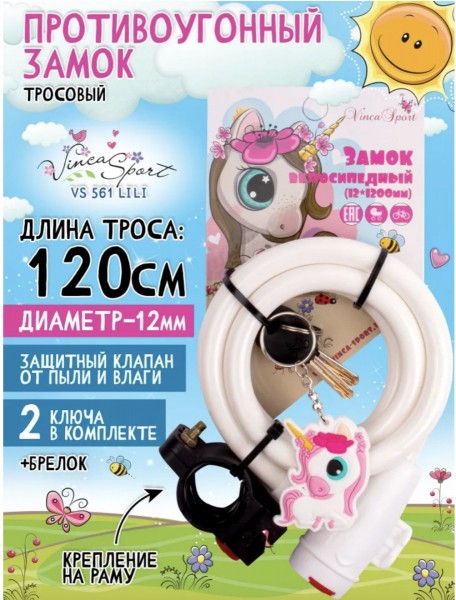 Каталог » Вело » Замки | вернуться к списку товаров Велозамок с брелком ПОНИ 12*1200мм защита от влаги + крепление, белый, VS 561 Lili
